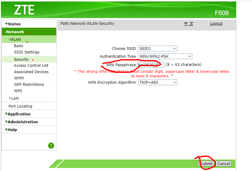 Pada menu utama klik network >wlan> security > dan ganti password pada kolom wpa.